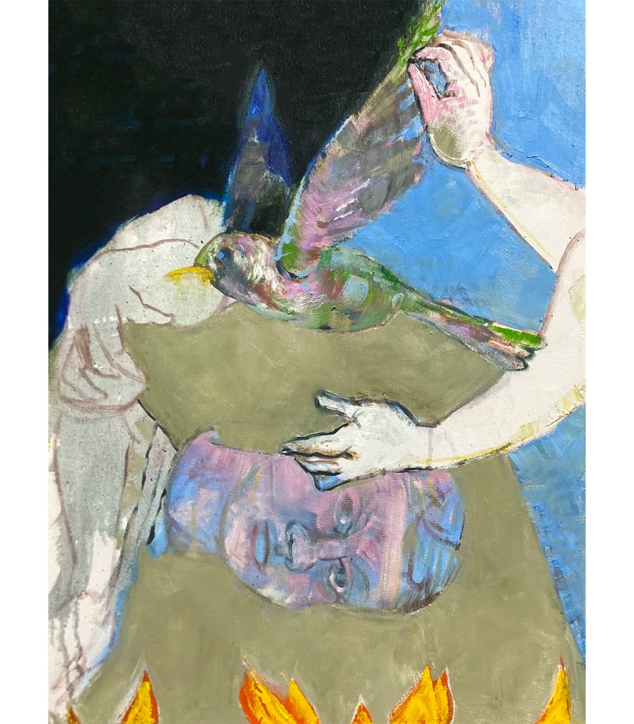 Shadow of a Bird 2026 Clinker, 2026, Oil on canvas,46 by 61 cm Framed, 2026, oil on canvas, 46 by 61 cm Mouse in the Garden, 2026, Oil on canvas, 76 by 61 cm Under Water, 2026, Oil on canvas, 87 by 87 cm