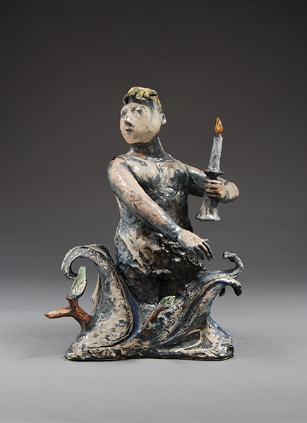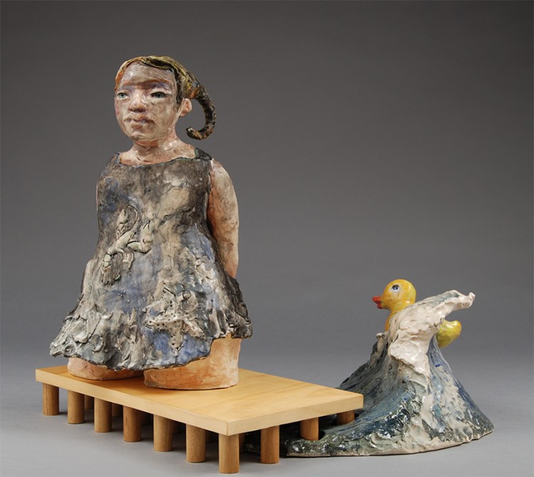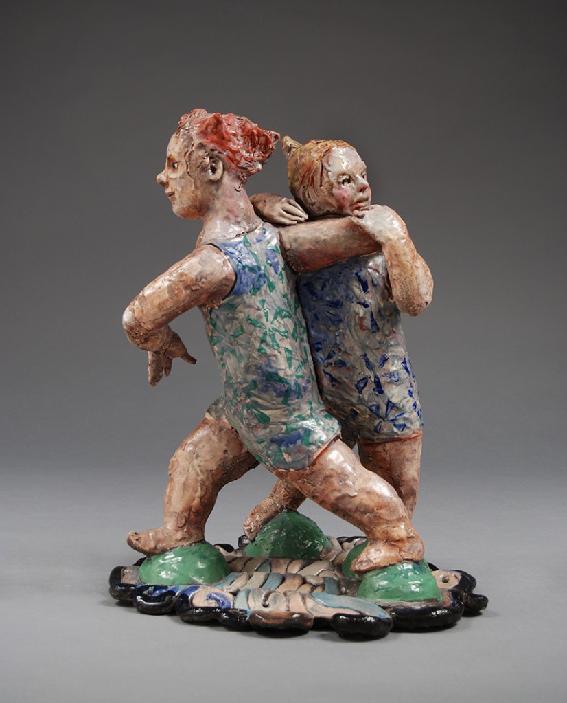 The exhibition comprised of 19 of Reed’s stoneware figurative sculptures creating the community of Furnace Cove. Eight monumental encaustics by Angela Antle created the environment that contained the community. A poetic response to the exhibition on the exhibition and the power and mystery of water by Dr. Shauna McCabe is included in the catalogue published and available from the Sir Wilfred Grenfell College Art Gallery.